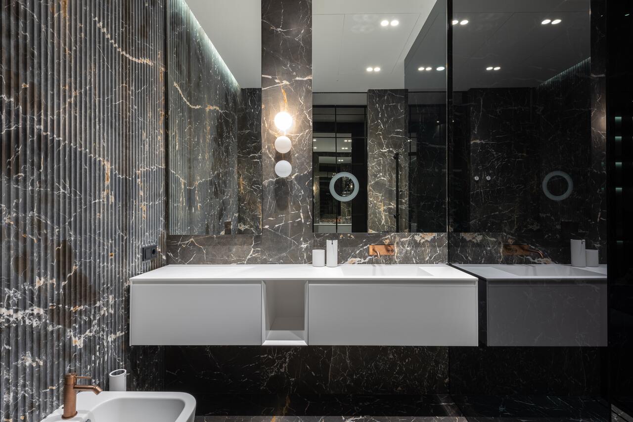 In this expansive bathroom designed by OreStudios, two sinks with matching cabinetry and countertops are positioned on opposite sides of the wall, while a built-in vanity in the same materials gives a space for getting ready and storing things on the other side.